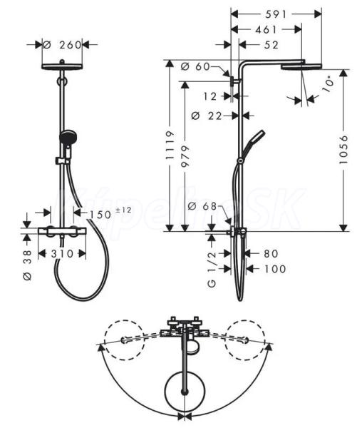 - guľový kĺb: nastaviteľný uhol hornej sprchy