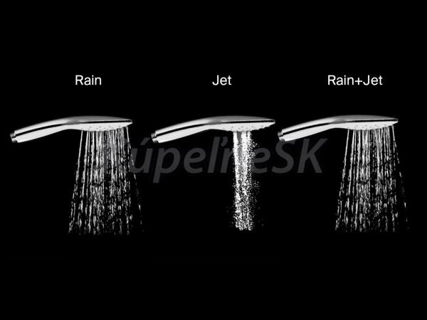 Ručná sprcha disponuje tromi funkciami intenzity prietoku vody. Režim prietoku Rain pripomína letný dážď a pôsobí na upokojenie pokožky. Pomocou funkcie Jet dosiahnete silný prietok zo stredu sprchy, ktorý intenzívne prekrví pokožku. Vhodný je aj pre čistenie menej dostupných miest v kúpeľni. Tretia funkcia ponúka kombináciu oboch týchto prietokov.