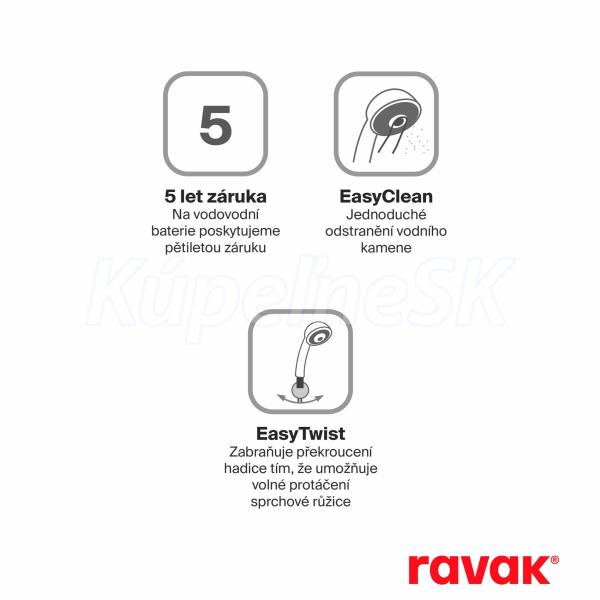 - flexibilná PVC sprchová hadica: dĺžka 150 cm; EasyTwist - zabraňuje prekrúteniu hadice a umožňuje voľné pretáčanie ručnej sprchy