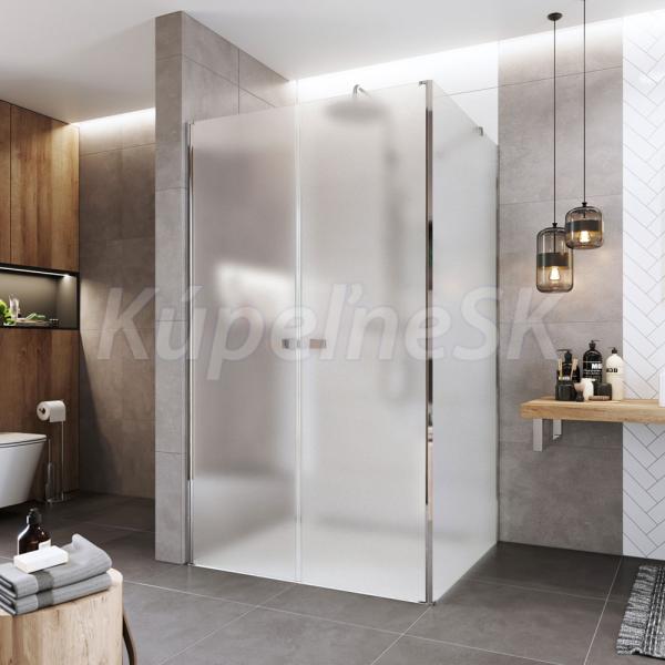 Hliníkové profily vo farbe chróm, lietacie dvere a pevný diel, sklo Point, sila skla 6 mm, obdĺžnik, 1200 (dvere) x 900 (pevný diel), výška 2000 mm.