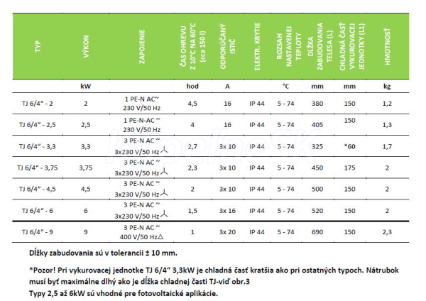 Elektrická závitová vykurovacia jednotka rady TJ je samostatné elektrické výhrevné zariadenie na vodu vybavené výhrevným telesom, prevádzkovým a bezpečnostným termostatom. Pripojuje sa na hrdlo so závitom G 6/4''. Výkon vykurovacieho telesa možeme voliť do výšky 9 kW, zapojenie 400 V. Termostat s vonkajším ovládaním umožňuje plynulé nastavenie teploty 0–80 °C. Využitie: Pomocný ohrev ohrievačov rady NTR/NTRR hlavne pri zapojení v solárnom systéme. Jednotka sa dá využiť na ohrev vody v iných zariadeniach pri dodržaní zásad v návode na použitie.