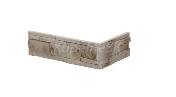 Betónový rohový obklad SANDI 1 v béžovom odtieni kameňa. Rohový prvok dopĺňa hlavný obklad a zabezpečuje plynulý prechod medzi stenou a vonkajším rohom. Vhodný do interiéru aj exteriéru, bez škárovania