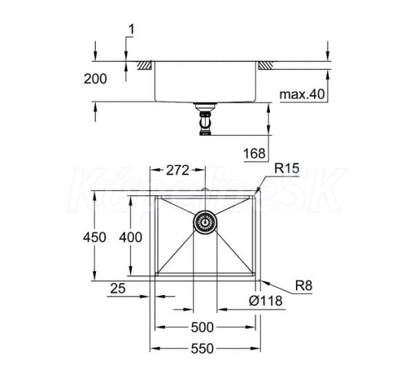 - vonkajší priemer: R16 (hĺbková montáž) / R3 (štandardná montáž ), vnútorný priemer drezu: R15
