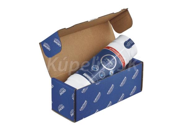 Vychutnajte si čistú, osviežujúcu a skvele chutiacu vodu priamo z kohútika – s technológiou GROHE Blue a filtrom GROHE Blue Ultrasafe. Filter má kapacitu až 3000 litrov a musí sa vymeniť po 6 mesiacoch používania. Inteligentný filter odstraňuje značné množstvo nežiaducich materiálov a nečistôt v 4 fázach: Predfiltrácia najprv odsaje hrubé častice, ako je piesok a nečistoty. Filtrácia aktívnym uhlím potom zjemňuje chuť vody tým, že filtruje látky s nepríjemnou chuťou (napr. chlór) a odstraňuje prirodzené znečistenie (napr. z domáceho vodovodu). Ďalej sa pomocou olovenej filtrácie odstráni až 99,5 % olova. A konečne membrána Ultrasafe zachytí aj tie najmenšie častice: mikroplasty (> 1 µm) a 99,999 % baktérií. Vytvára bariéru proti škodlivým mikroorganizmom a zaručuje úplnú čistotu a hygienu. Výsledkom je dokonale čistá, pitná voda. Filter je kompatibilný so systémami GROHE Blue Home, GROHE Blue Professional a GROHE Blue Pure. Výmena filtra je ľahká: jednoducho odskrutkujte starý filter, vložte čistiacu kazetu GROHE (40434001)* (pre GROHE Blue Pure nie je potrebná), spustite proces čistenia a potom ho vymeňte za nový filter. *Je potrebný taktiež adaptér čistiacej kazety GROHE Blue na opakované použitie (40694000).