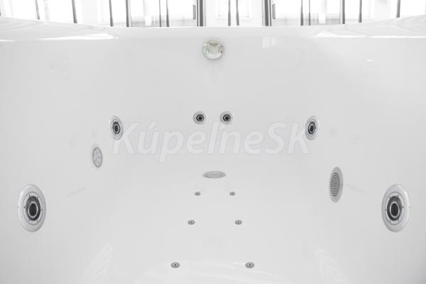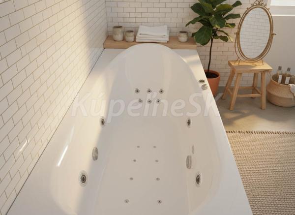 • Objem: 183 litrů při maximálním napuštění (vanu není potřeba napouštět do jejího plného objemu, pro použití masážních trysek stačí vanu naplnit po horní hranu nejvýše položených trysek).