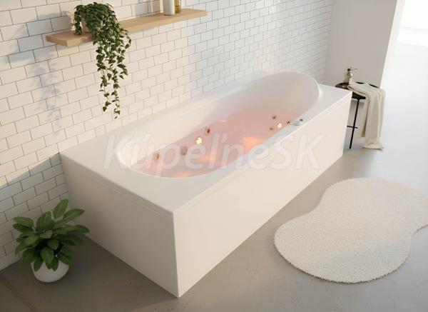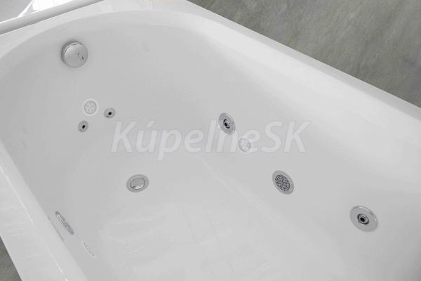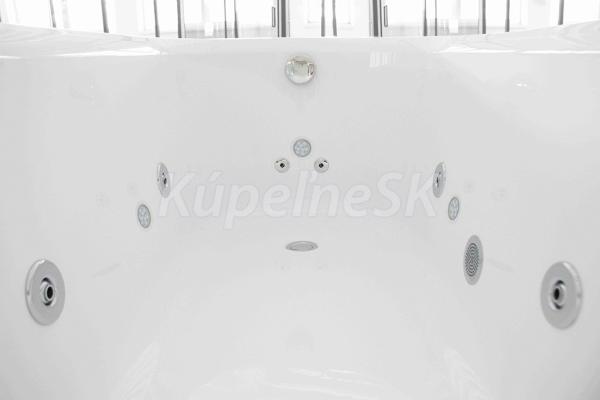 - Objem: 183 litrů při maximálním napuštění (vanu není potřeba napouštět do jejího plného objemu, pro použití masážních trysek stačí vanu naplnit po horní hranu nejvýše položených trysek).