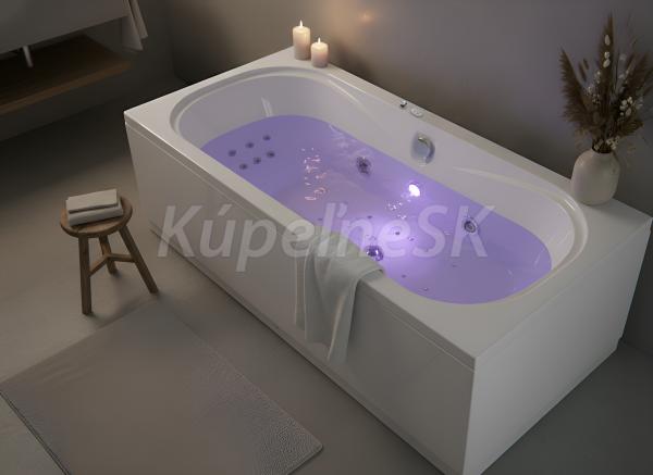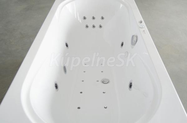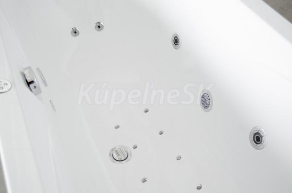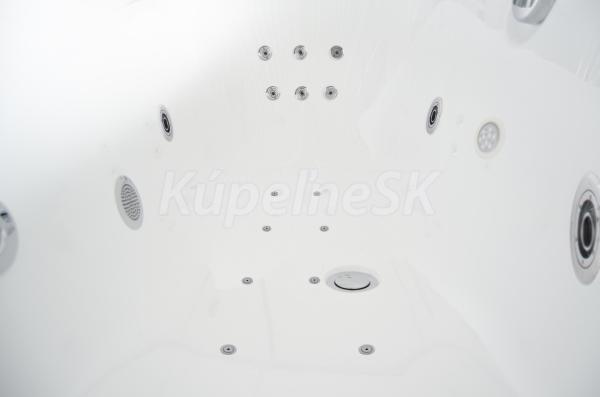 - Objem: 183 litrů při maximálním napuštění (vanu není potřeba napouštět do jejího plného objemu, pro použití masážních trysek stačí vanu naplnit po horní hranu nejvýše položených trysek).