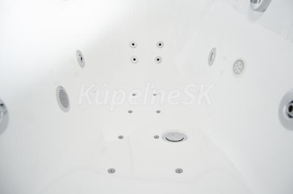 • Objem: 183 litrů při maximálním napuštění (vanu není potřeba napouštět do jejího plného objemu, pro použití masážních trysek stačí vanu naplnit po horní hranu nejvýše položených trysek).